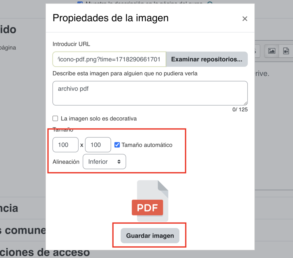 Pega el enlace del PDF de Google Drive que copiaste anteriormente en el campo “URL”.