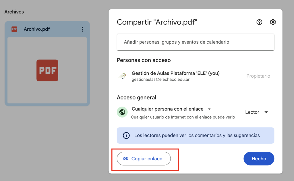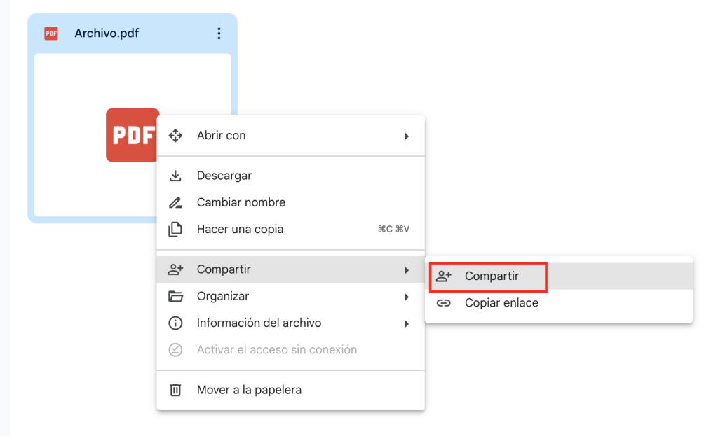 Una vez subido, haz clic derecho sobre el archivo PDF y selecciona “Compartir”.