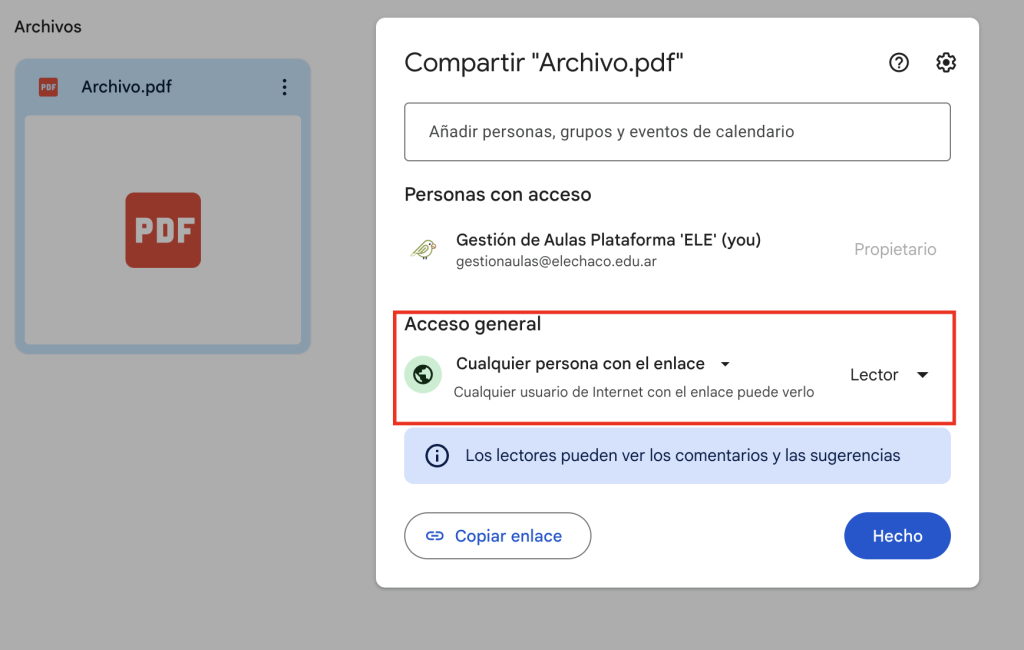 En la ventana emergente, asegúrate de que el enlace esté configurado para que cualquier persona con el enlace pueda verlo. Esto se puede hacer cambiando la opción “Restrictivo” a “Cualquier persona con el enlace”.