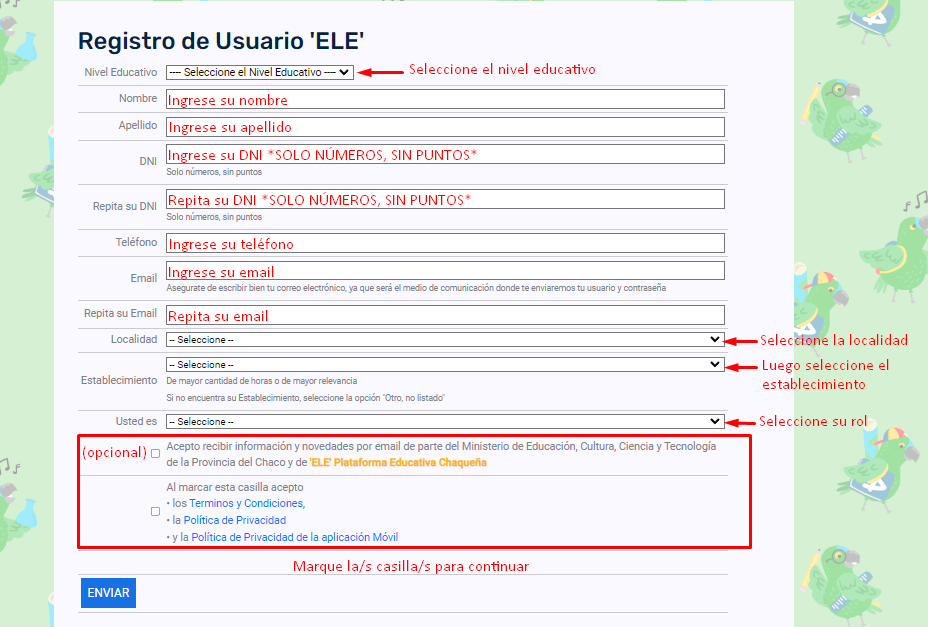 2. Una vez completados todos los campos, haz clic en el botón “ENVIAR”.